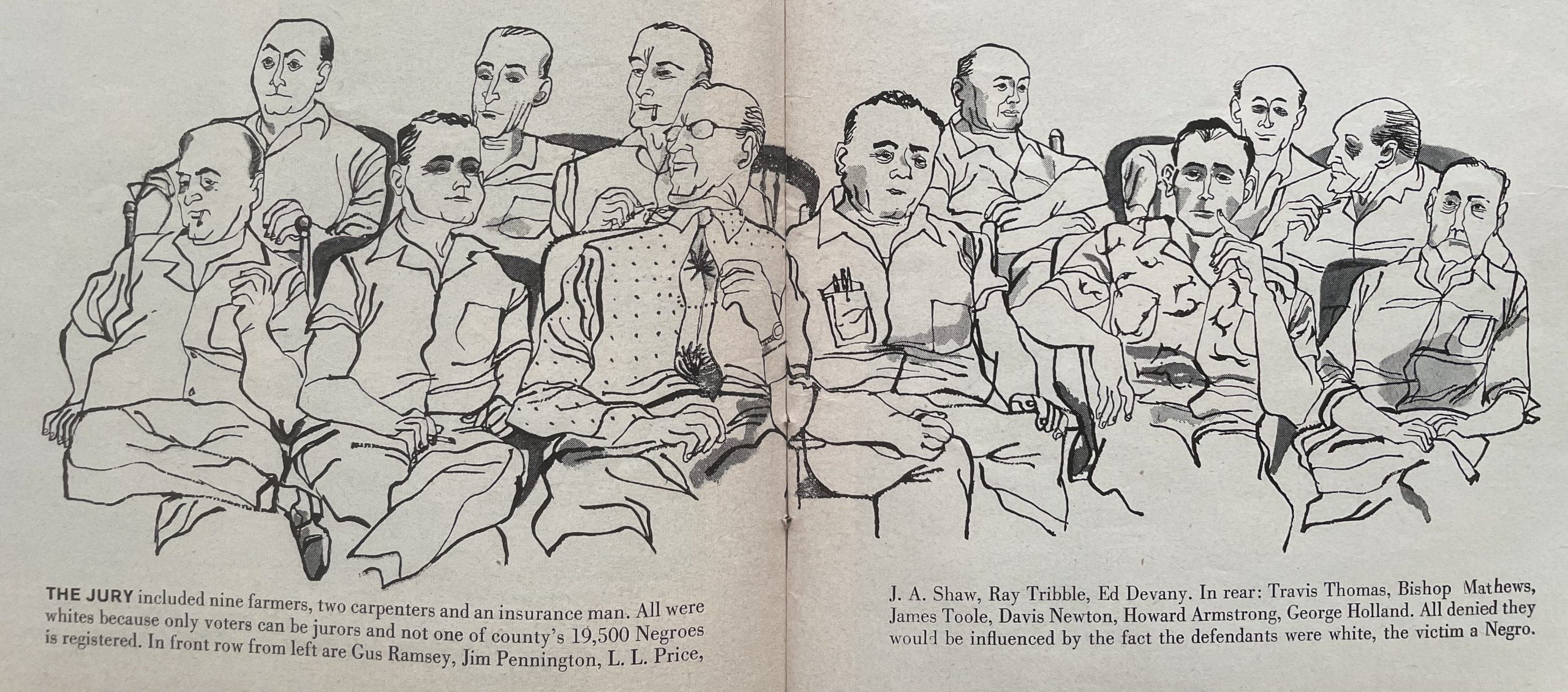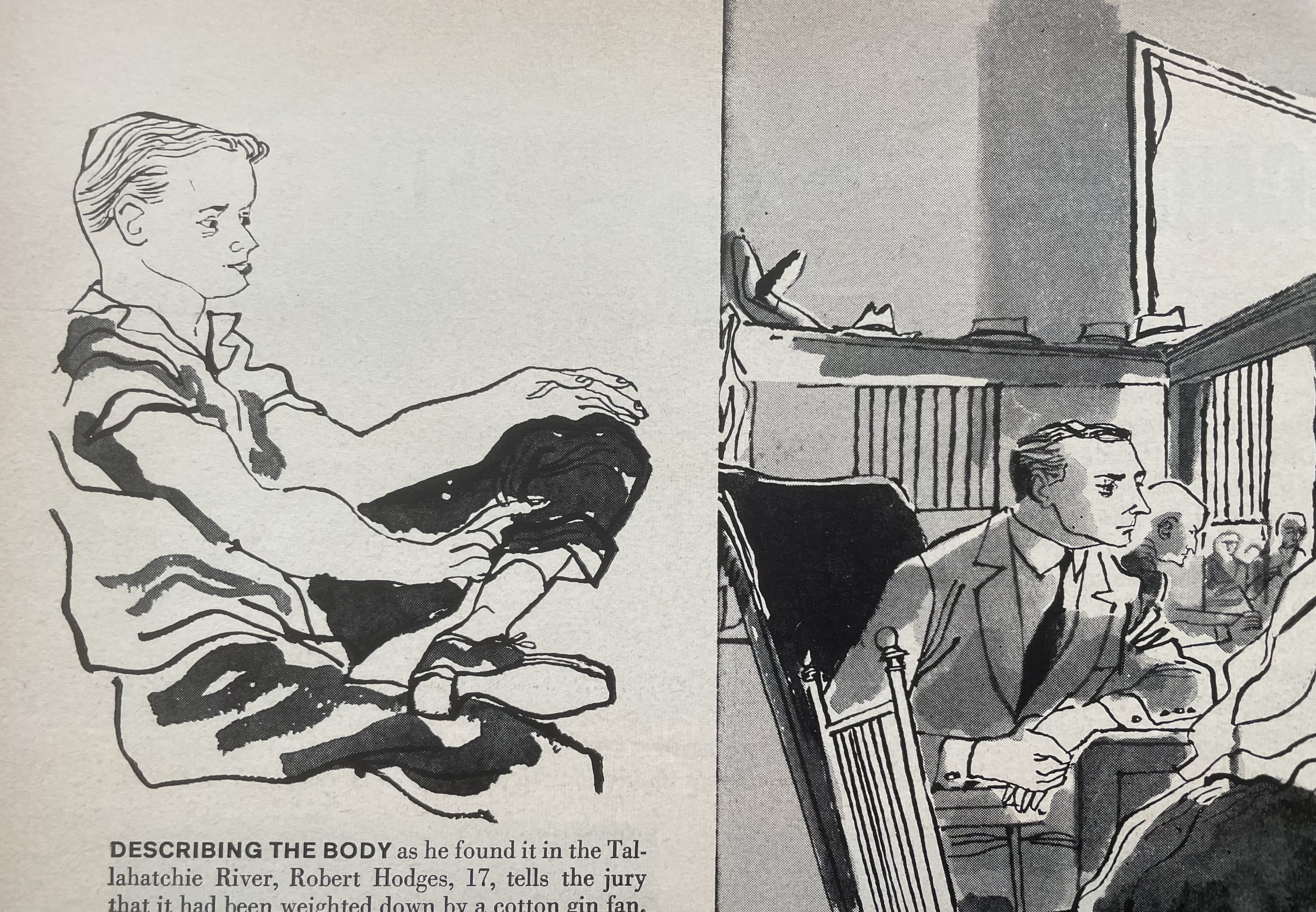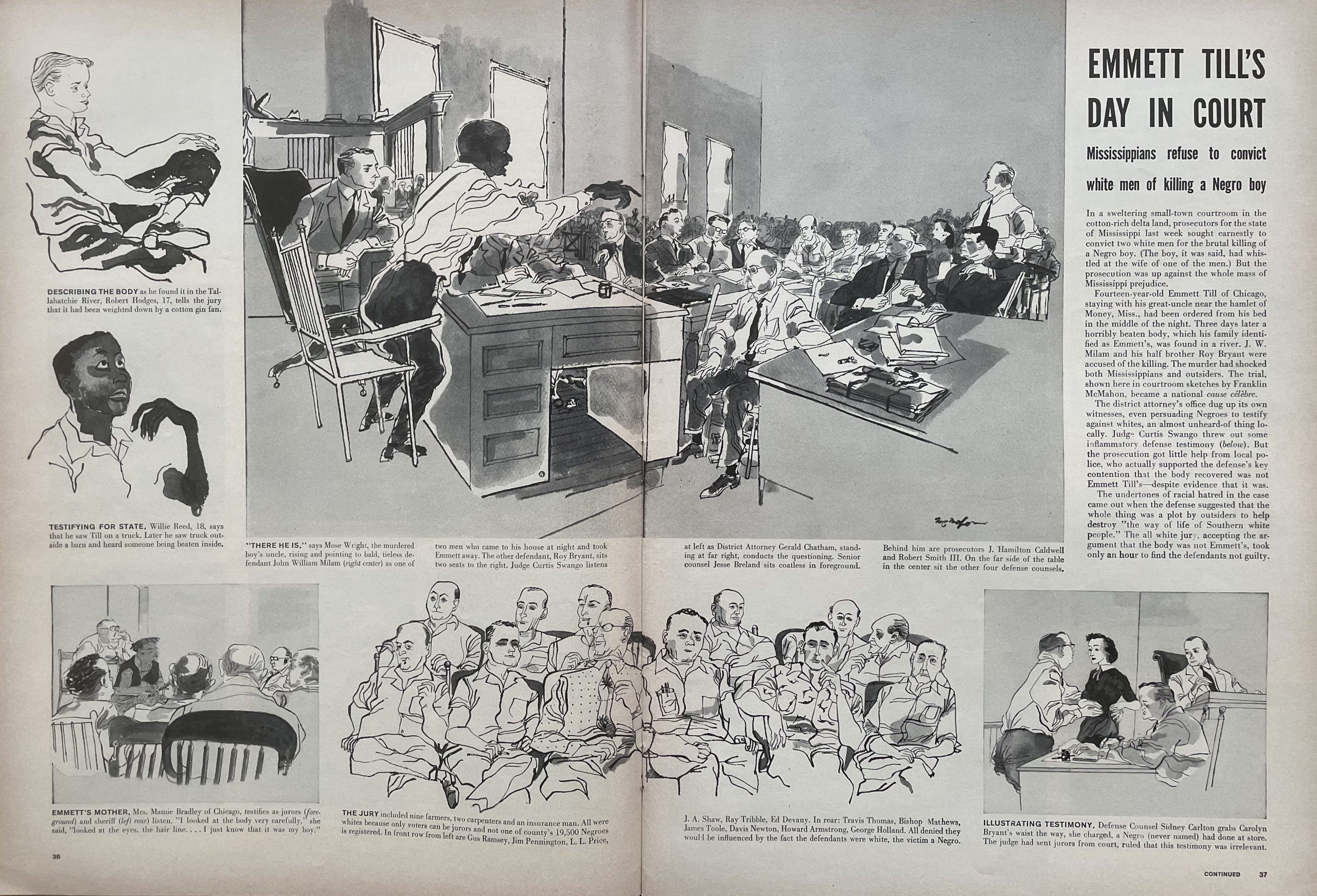 Life, October 3, 1955 : Reportage drawings by Franklin McMahon from the Emmett Till trial in Sumner, Mississippi. The 14-year-old Till had been lynched and murdered; two white defendants were acquitted after a short deliberation. With photography banned, McMahon’s sketches document witnesses, jury, and the courtroom scene. Months later, the acquitted men openly admitted their crime in a magazine interview.