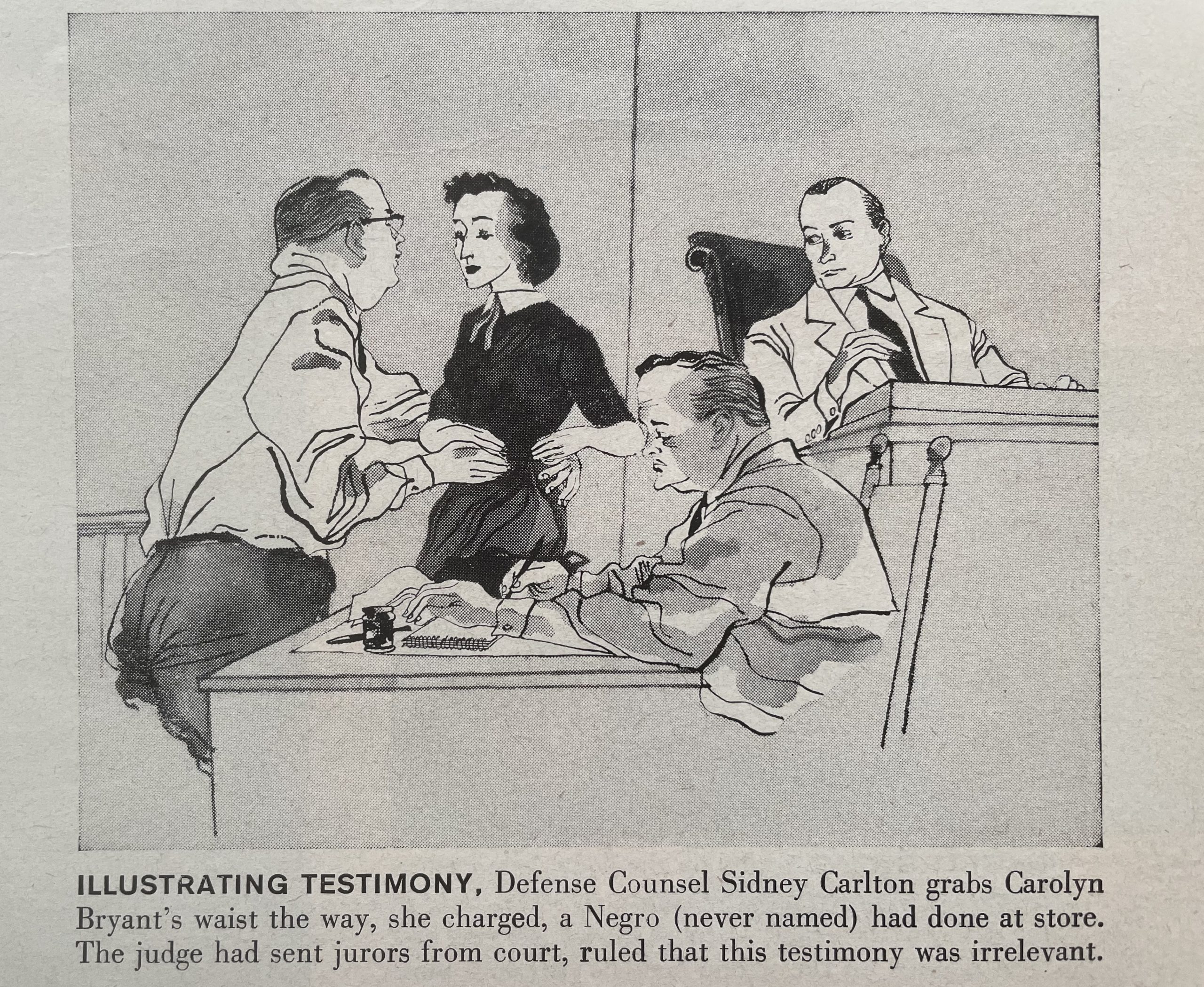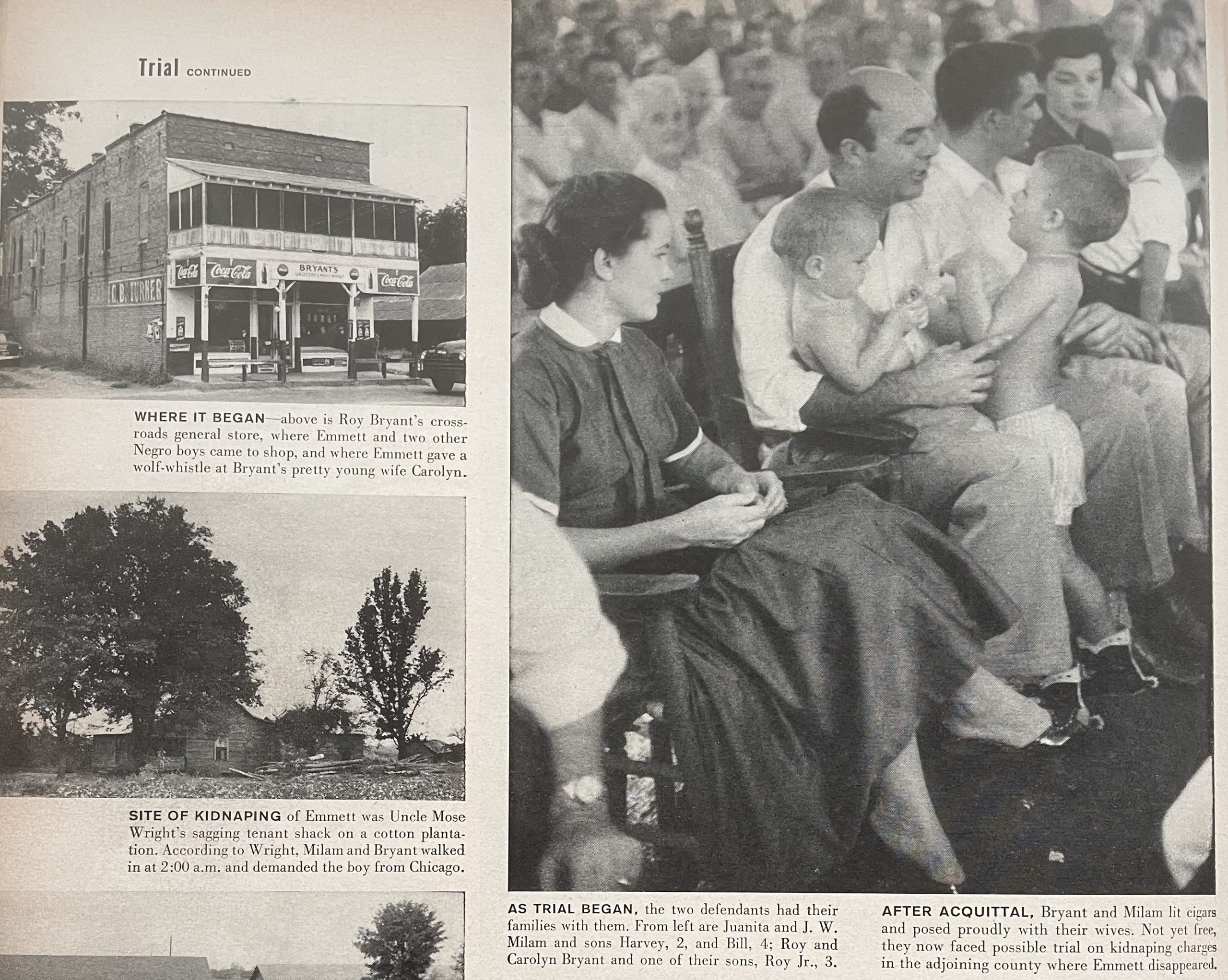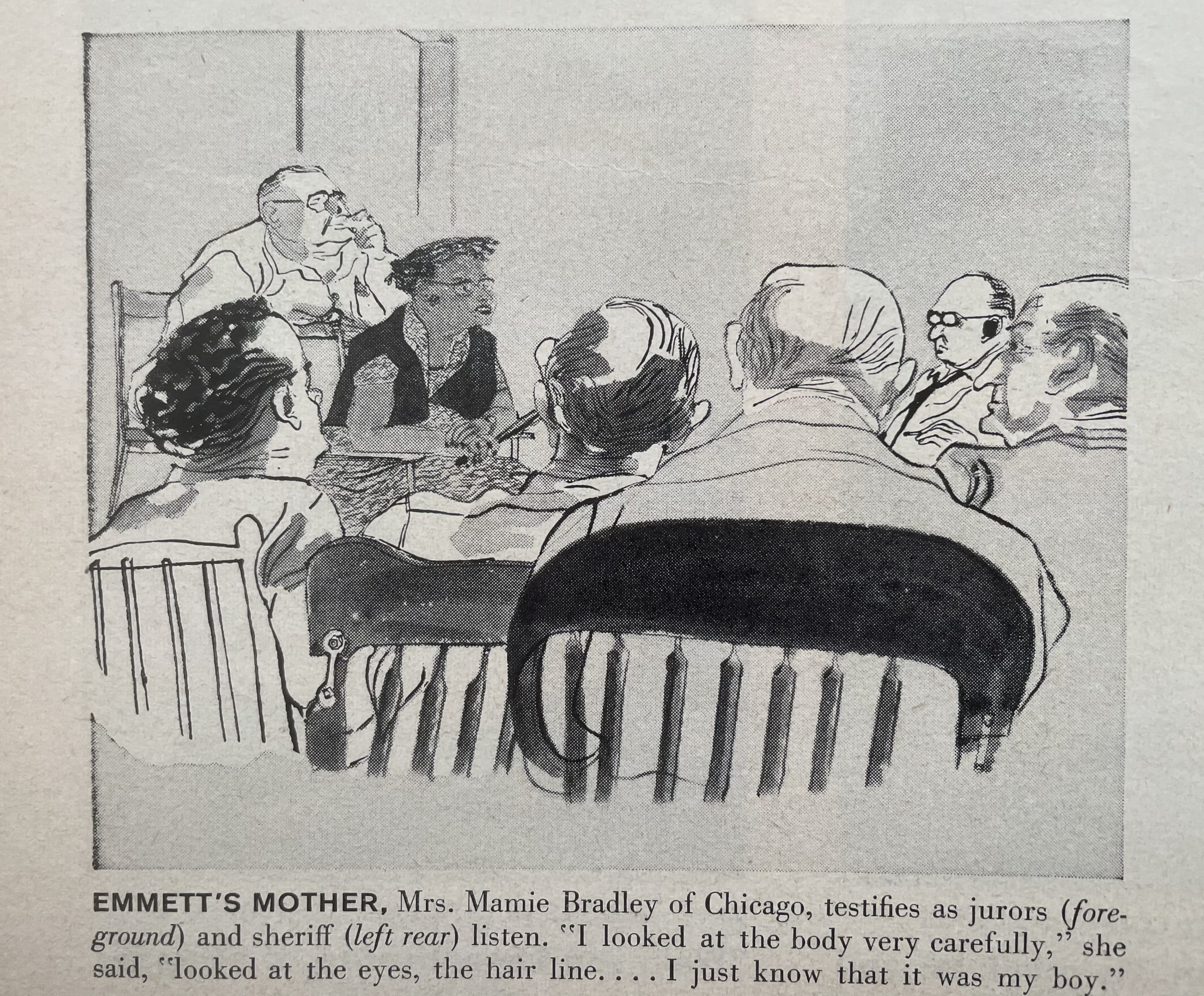 Life, October 3, 1955 : Reportage drawings by Franklin McMahon from the Emmett Till trial in Sumner, Mississippi. The 14-year-old Till had been lynched and murdered; two white defendants were acquitted after a short deliberation. With photography banned, McMahon’s sketches document witnesses, jury, and the courtroom scene. Months later, the acquitted men openly admitted their crime in a magazine interview.