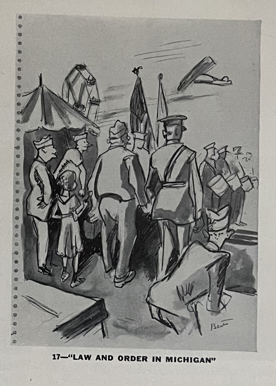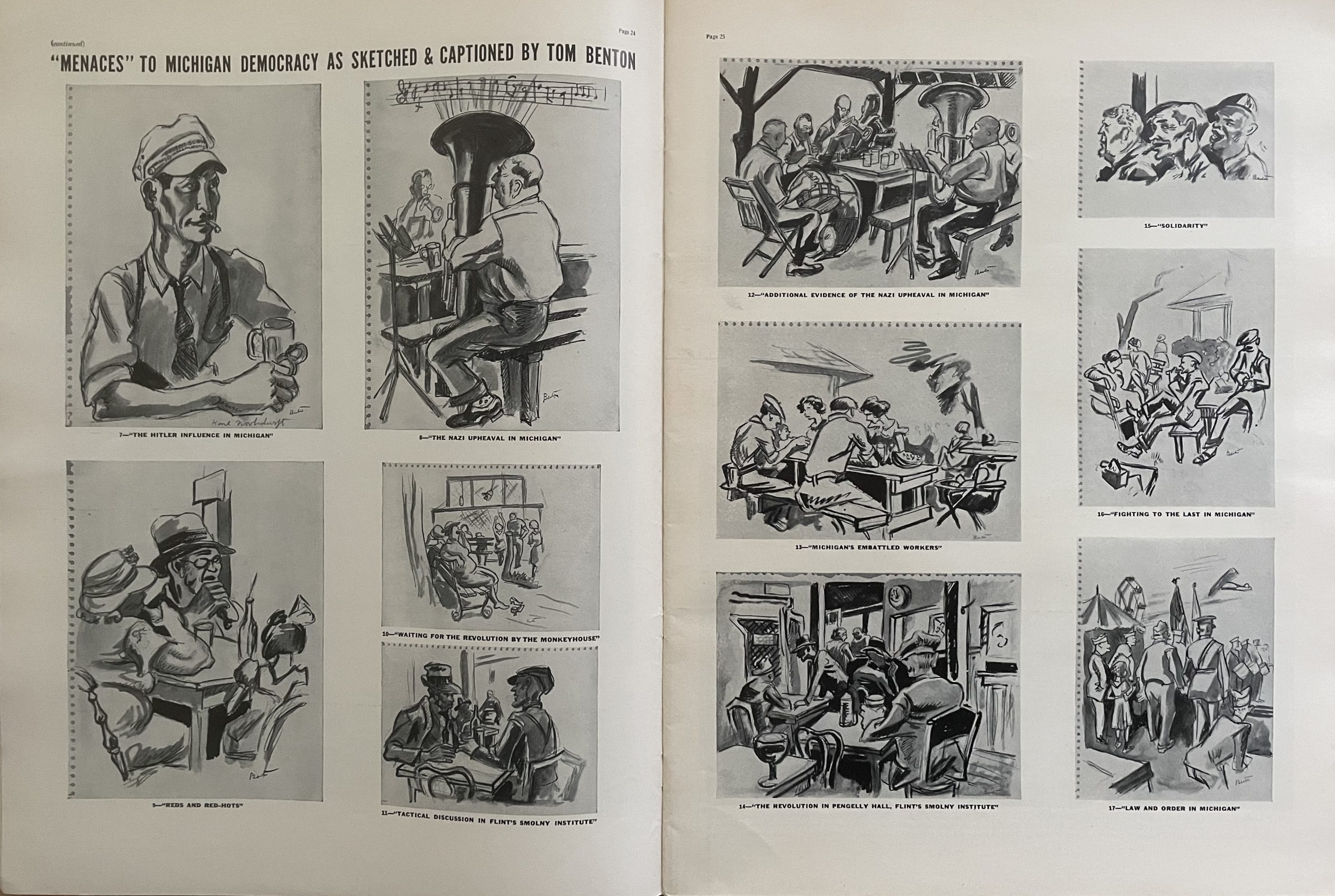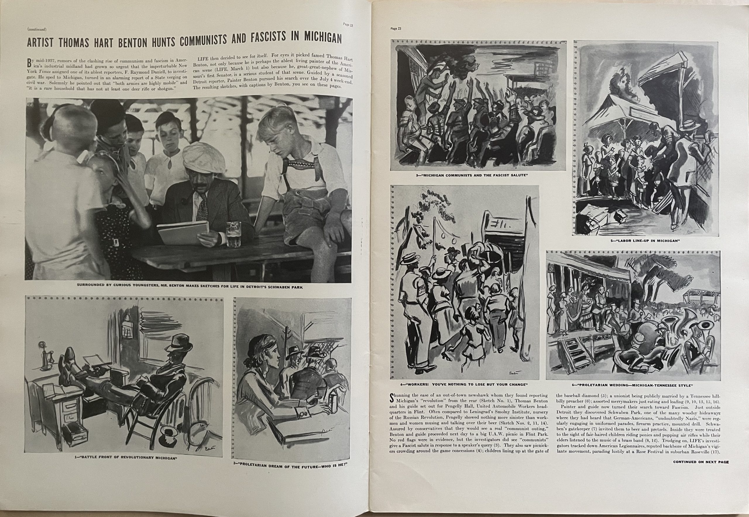 Life, July 26, 1937 : American Regionalist Thomas Hart Benton, later known as Jackson Pollock’s teacher, took on the role of reportage artist in Michigan. In brush-and-ink sketches for Life, he depicted what he labeled “menaces to democracy”: communists, strikers, and Nazi sympathizers. The drawings reflect both the Depression-era tensions and Benton’s mix of satire and alarmism.