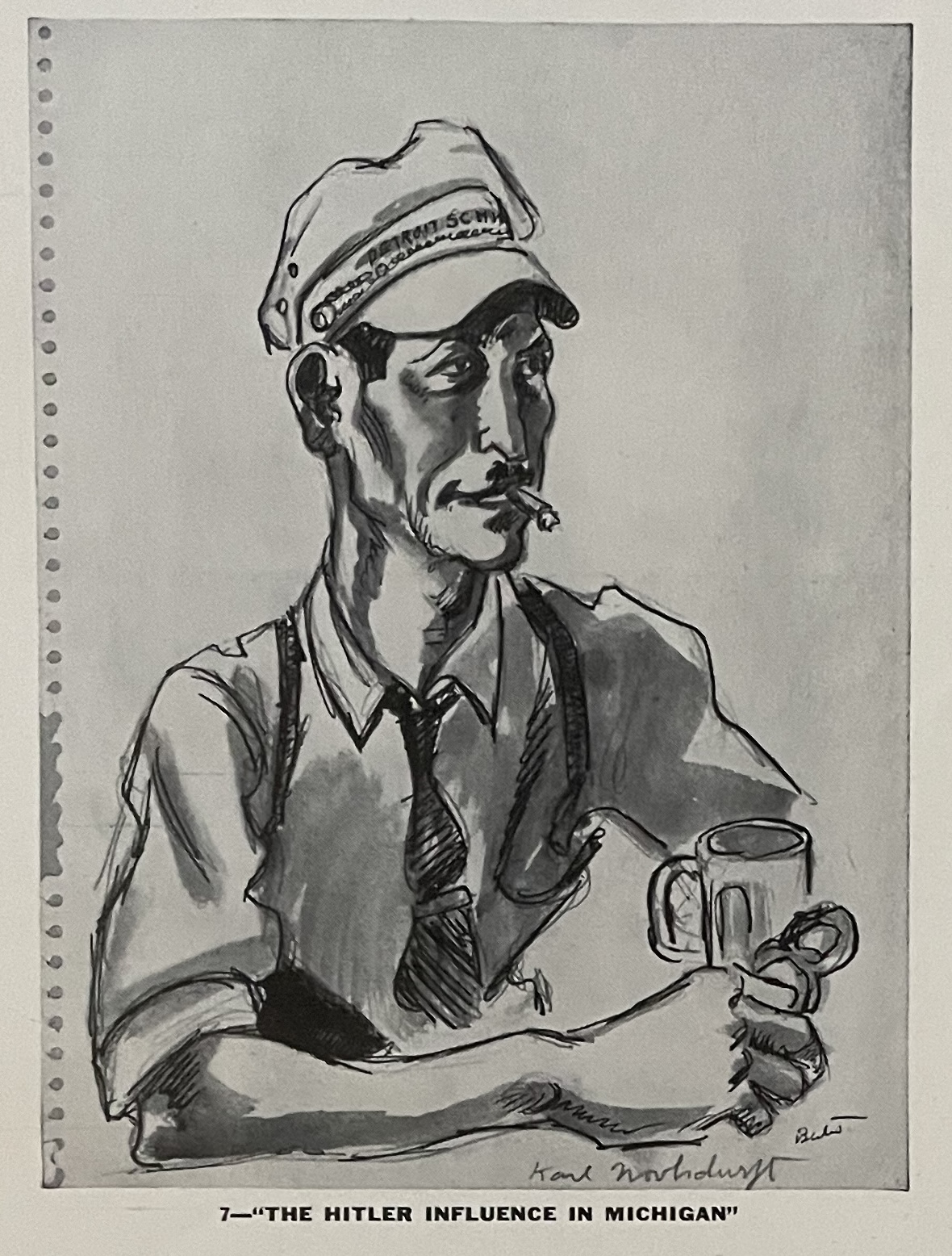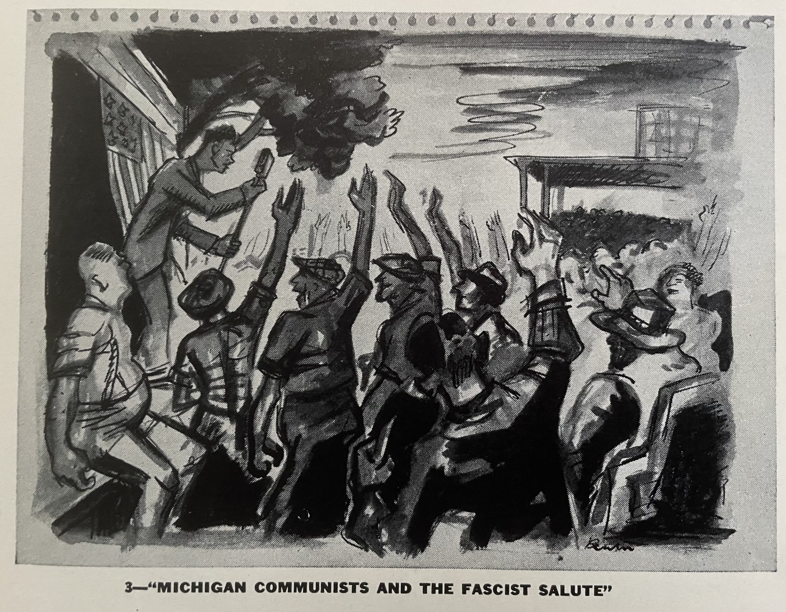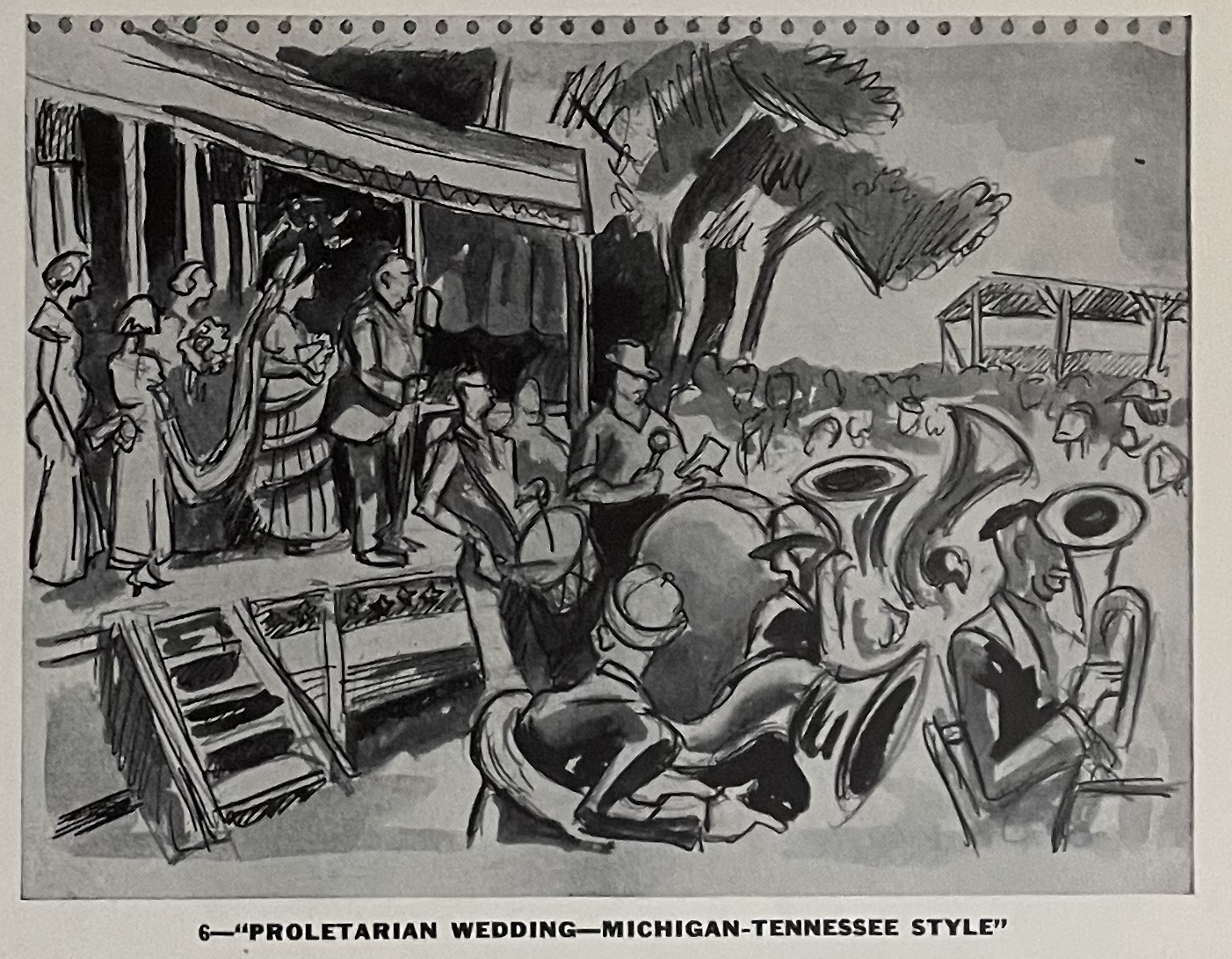 Life, July 26, 1937 : American Regionalist Thomas Hart Benton, later known as Jackson Pollock’s teacher, took on the role of reportage artist in Michigan. In brush-and-ink sketches for Life, he depicted what he labeled “menaces to democracy”: communists, strikers, and Nazi sympathizers. The drawings reflect both the Depression-era tensions and Benton’s mix of satire and alarmism.