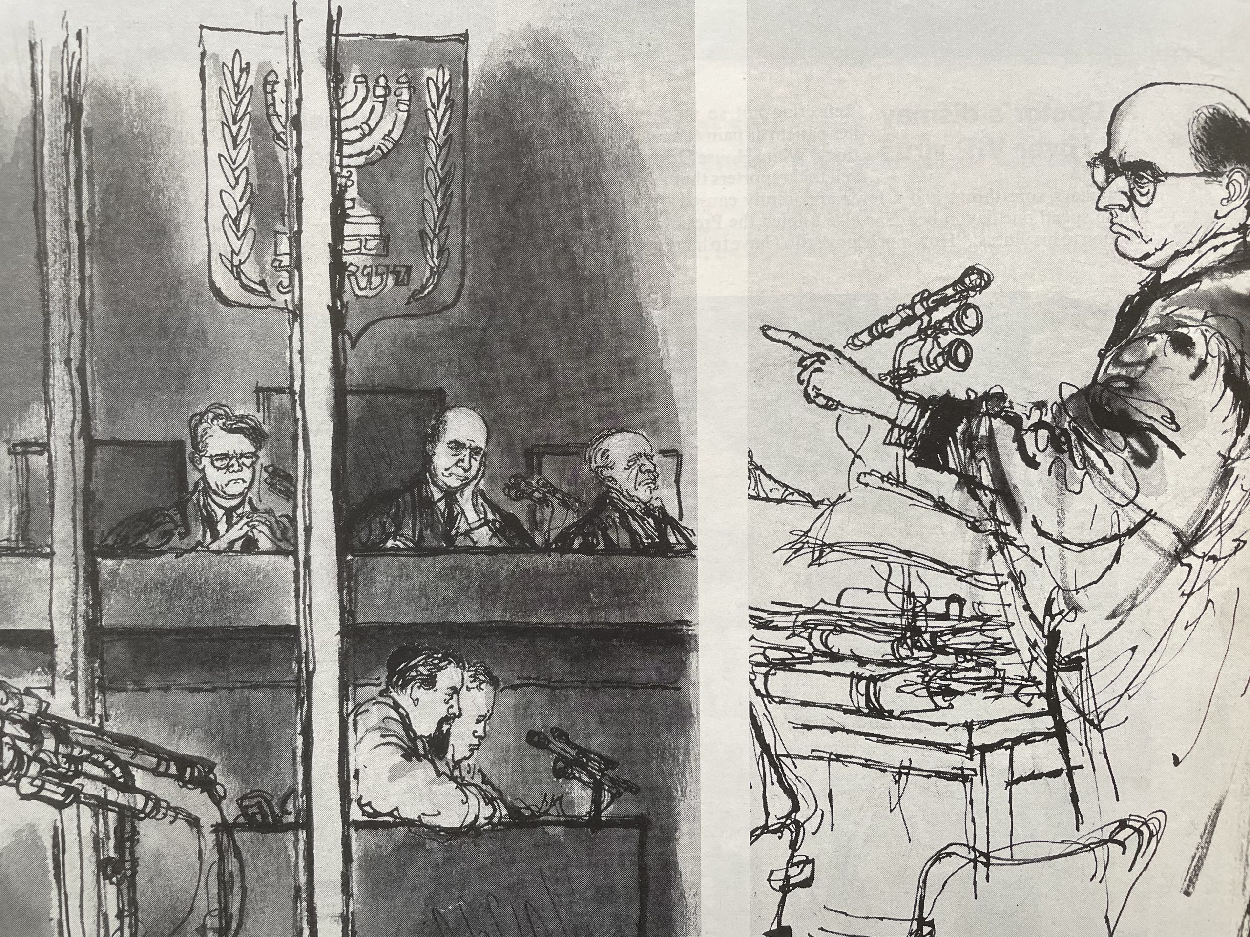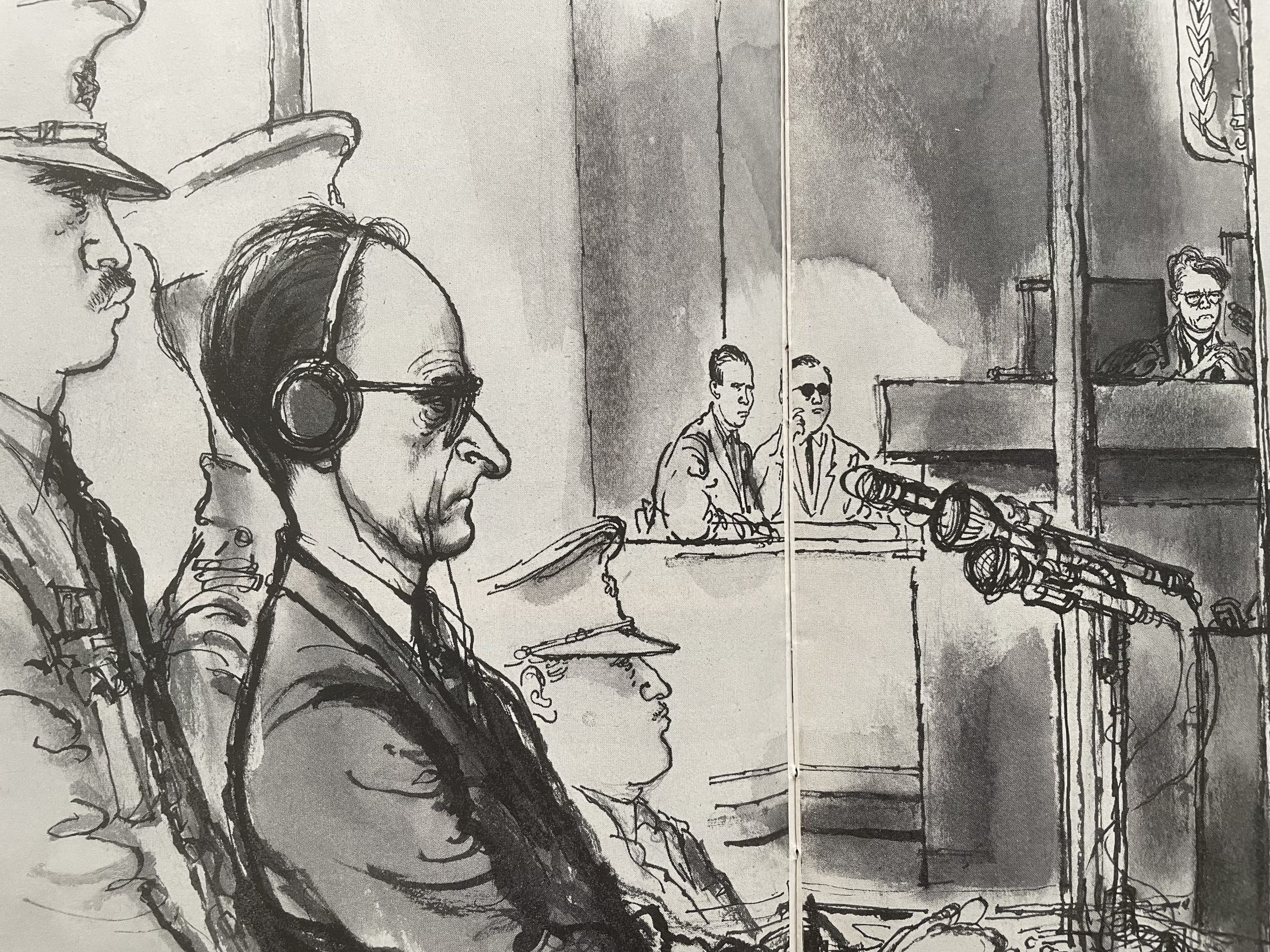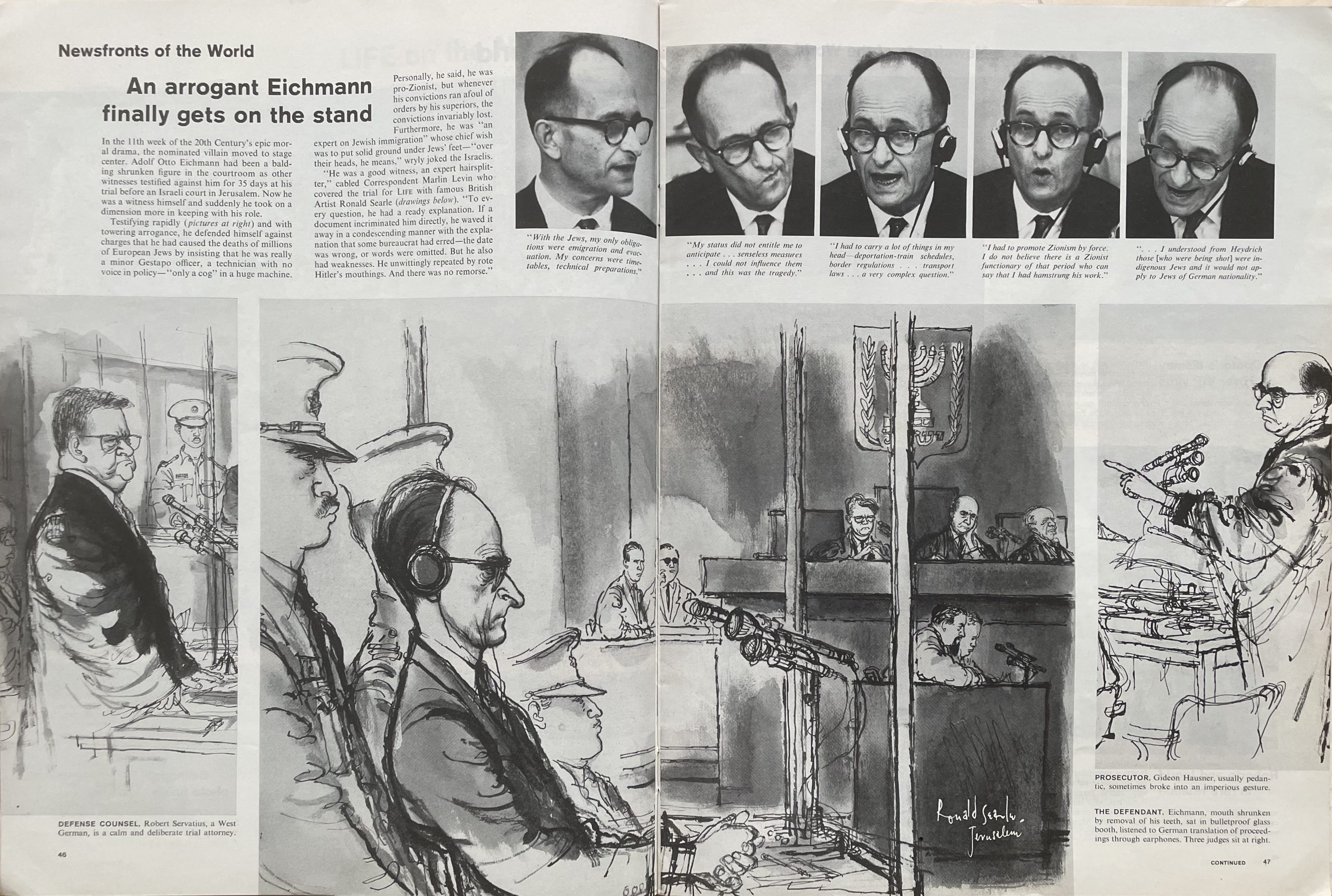 Life, June 30, 1961: Ronald Searle reported from Jerusalem as Adolf Eichmann faced trial. His drawings did not aim at sober accuracy; with a nervous, almost grotesque line, Searle caught Eichmann’s bureaucratic gestures and the courtroom ritual. The result is a precarious balance between documentation and caricature.