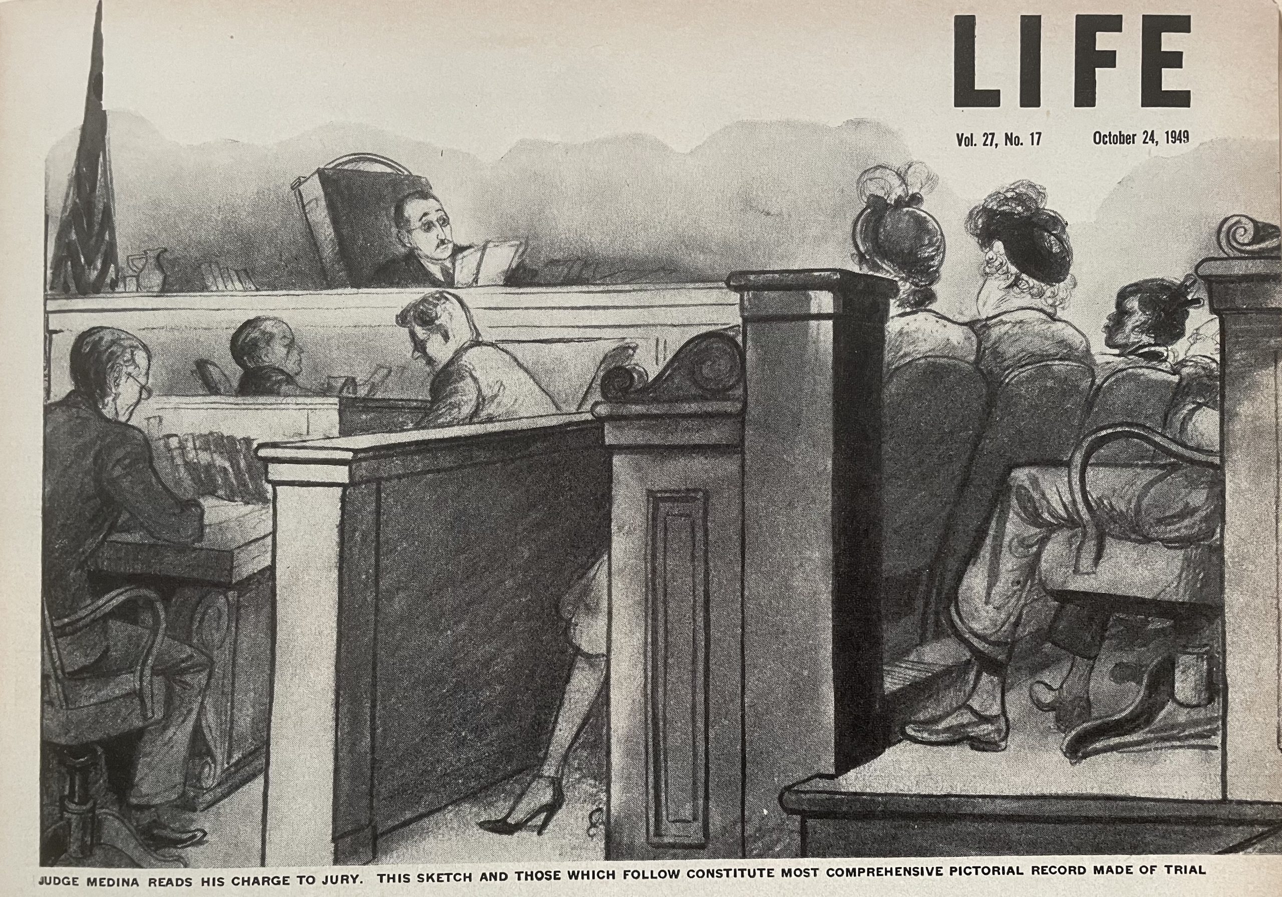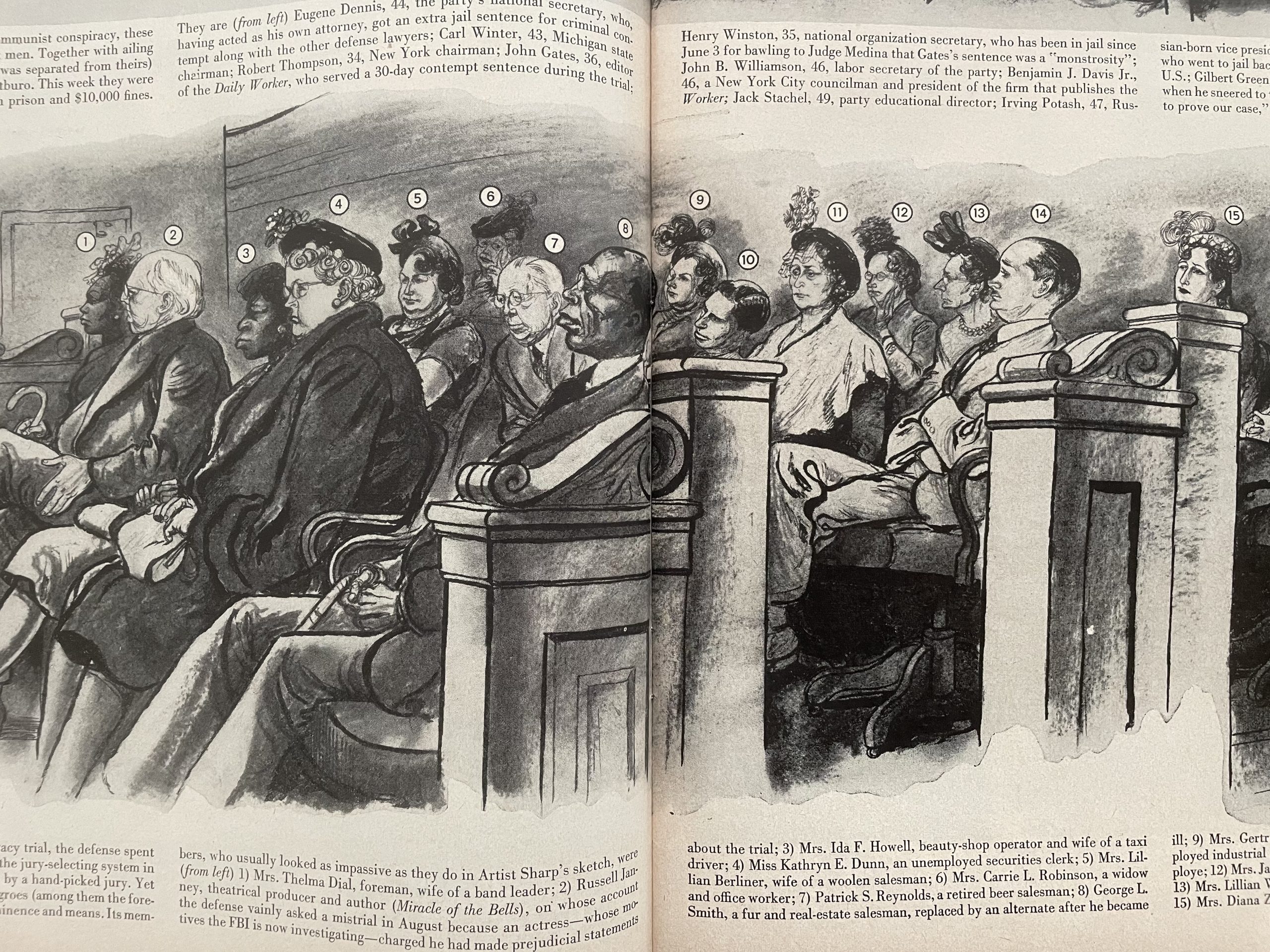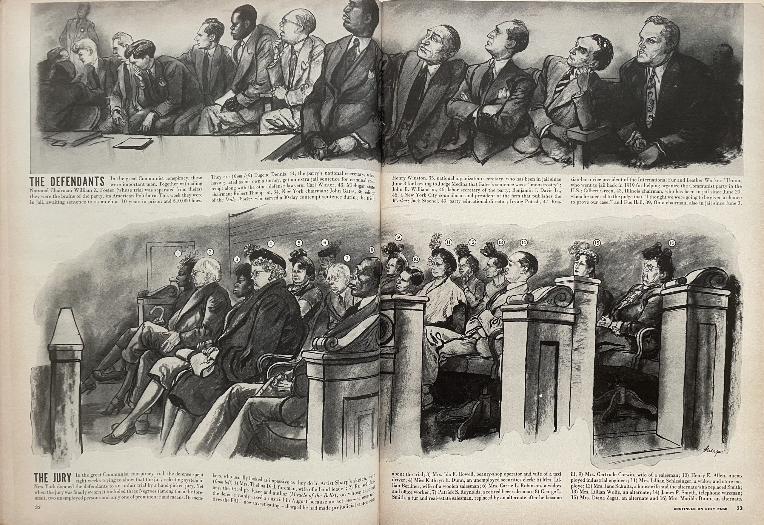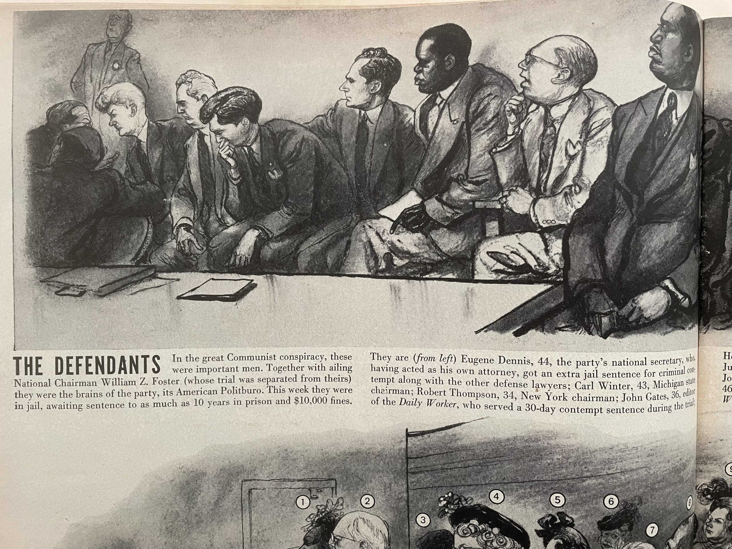 Life, October 24, 1949 : William Sharp sketched the Smith Act trial of eleven Communist Party leaders in New York. All were sentenced to prison, in a case that marked the beginning of Cold War anticommunist prosecutions and foreshadowed the McCarthy era. Sharp, born Leon Schleifer in Vienna, had fled Europe in 1934 after his antifascist caricatures made him a target. In the U.S. he worked as illustrator and courtroom artist for Life, Esquire, and other magazines.