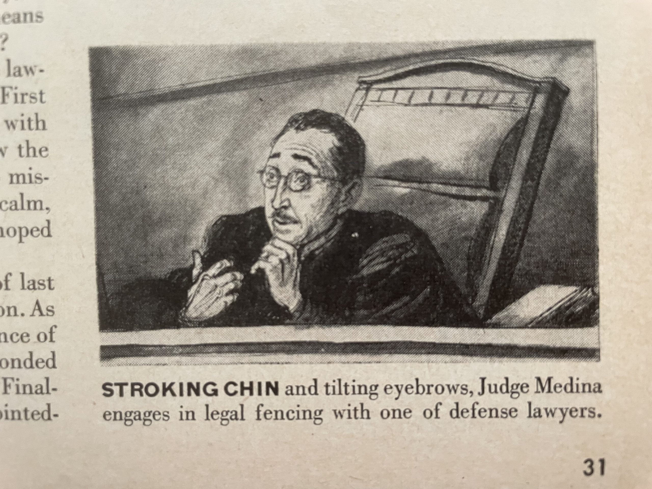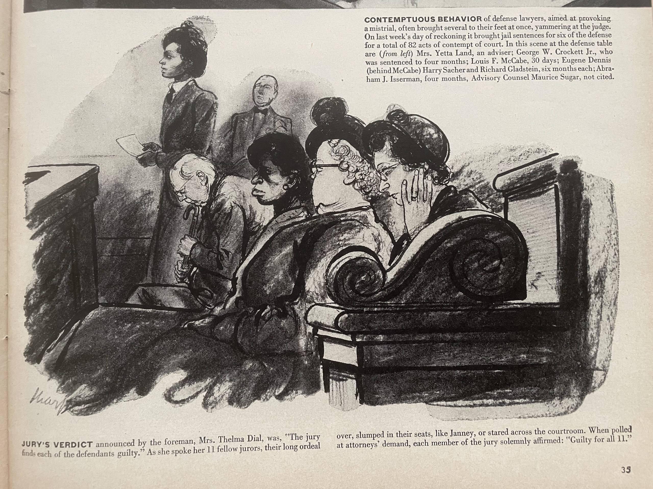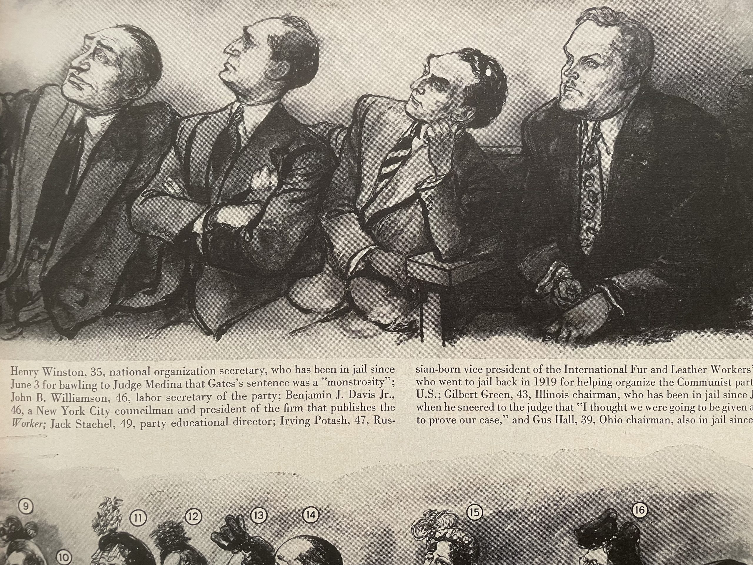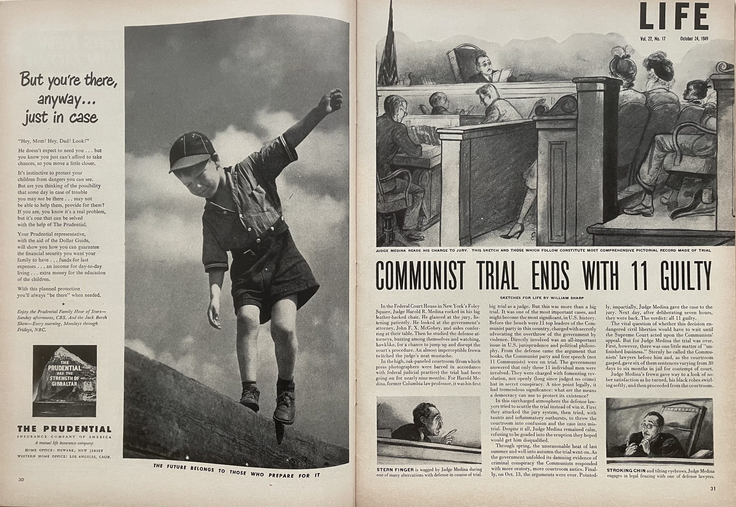 Life, October 24, 1949 : William Sharp sketched the Smith Act trial of eleven Communist Party leaders in New York. All were sentenced to prison, in a case that marked the beginning of Cold War anticommunist prosecutions and foreshadowed the McCarthy era. Sharp, born Leon Schleifer in Vienna, had fled Europe in 1934 after his antifascist caricatures made him a target. In the U.S. he worked as illustrator and courtroom artist for Life, Esquire, and other magazines.
