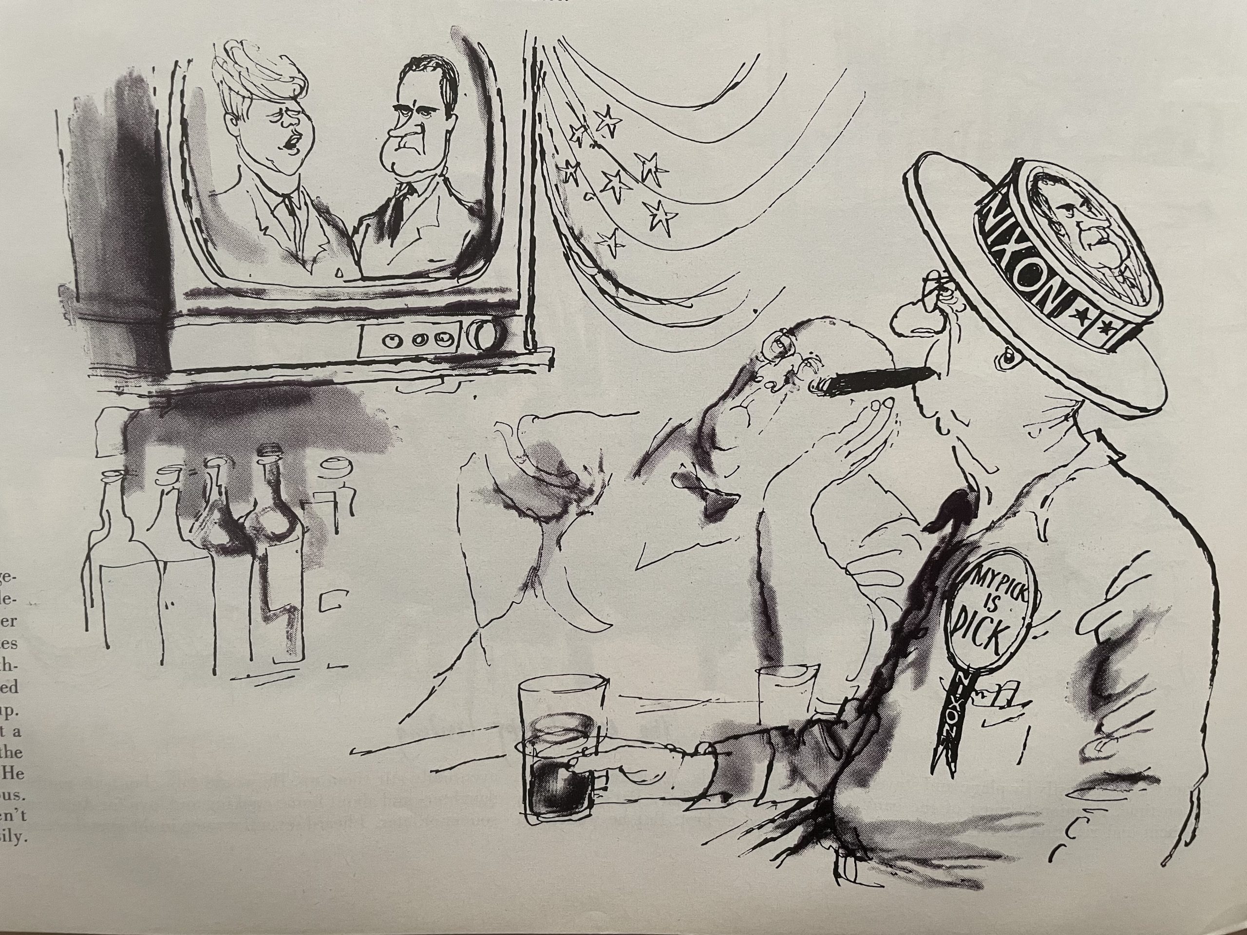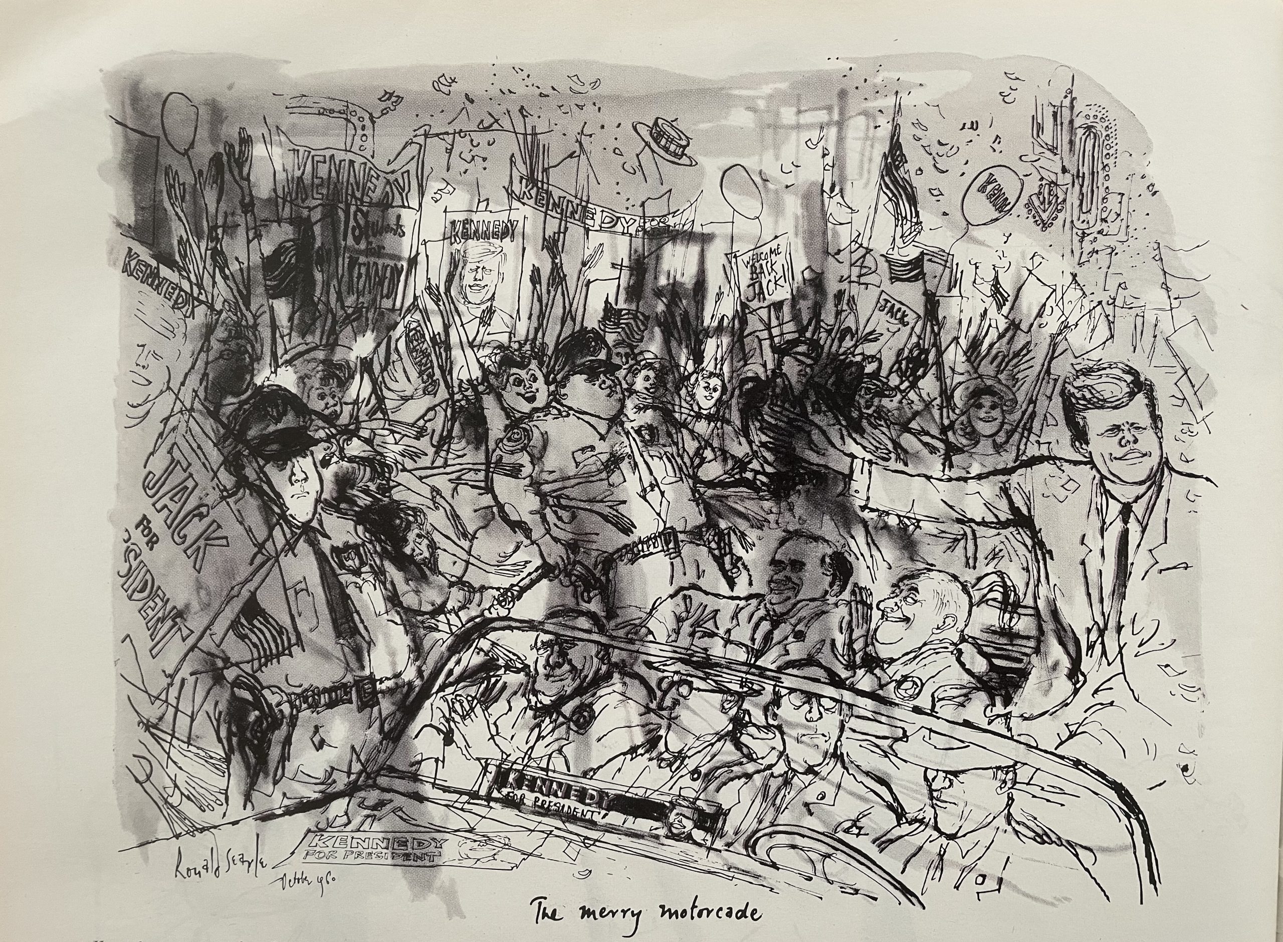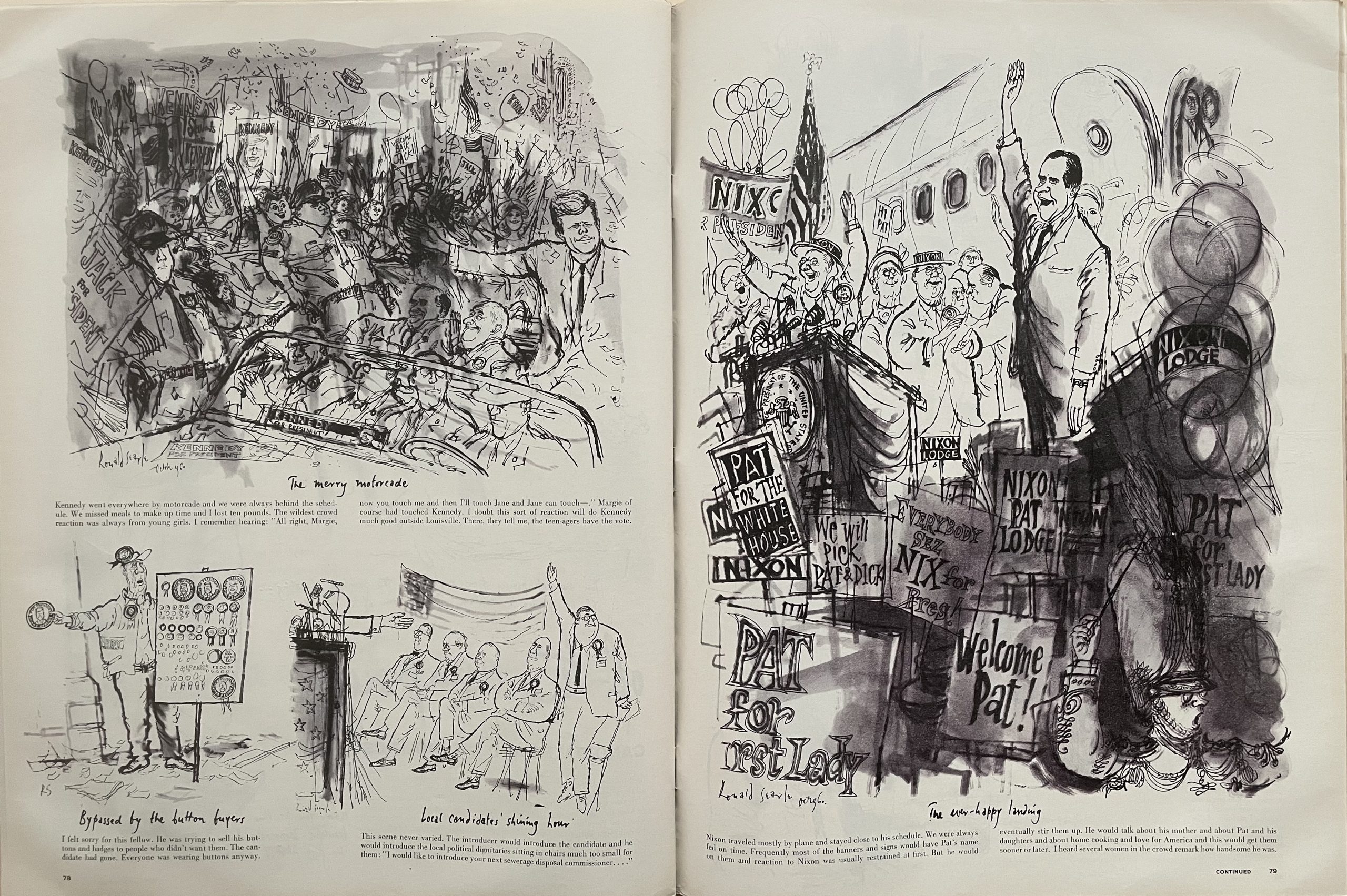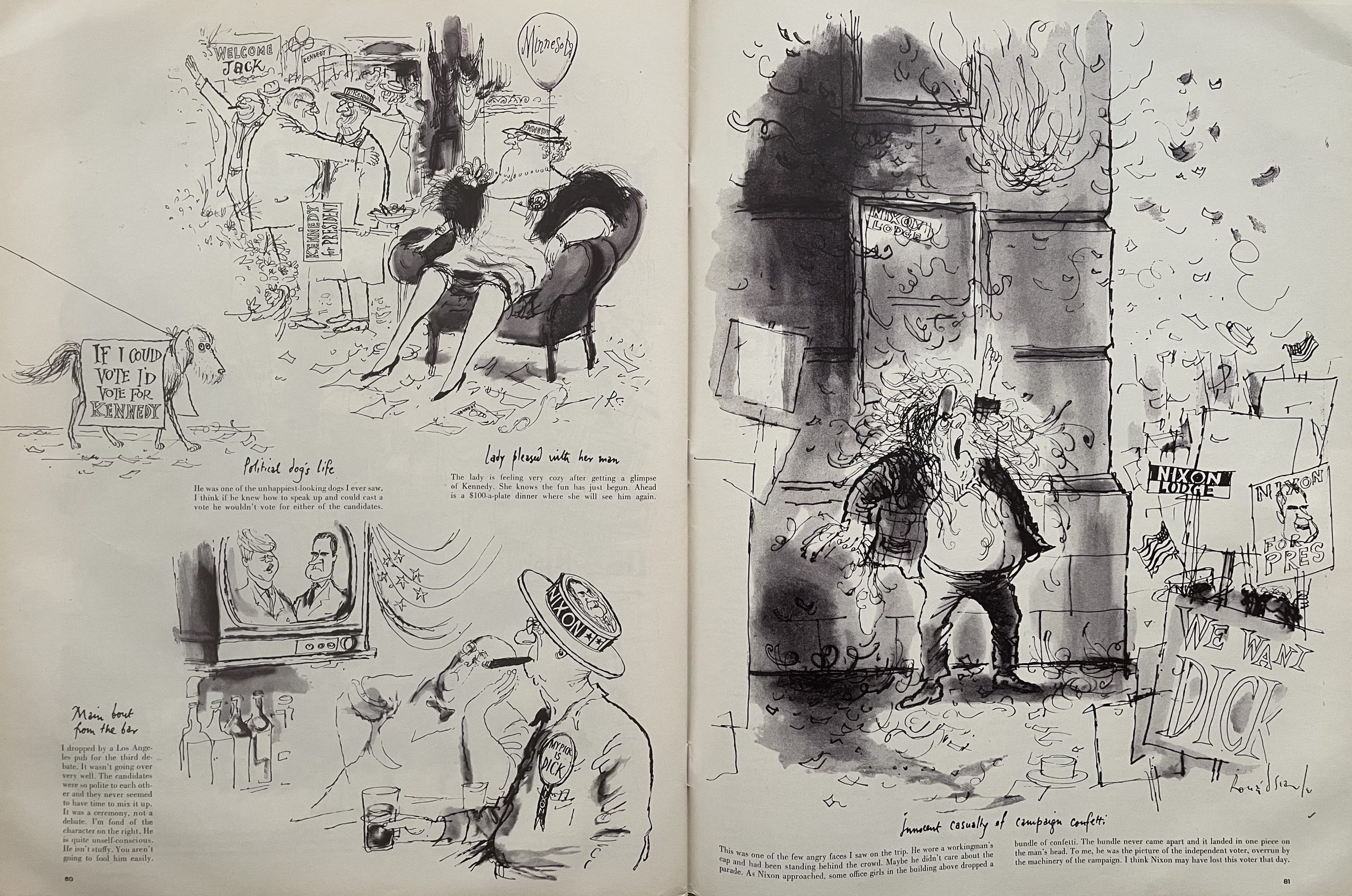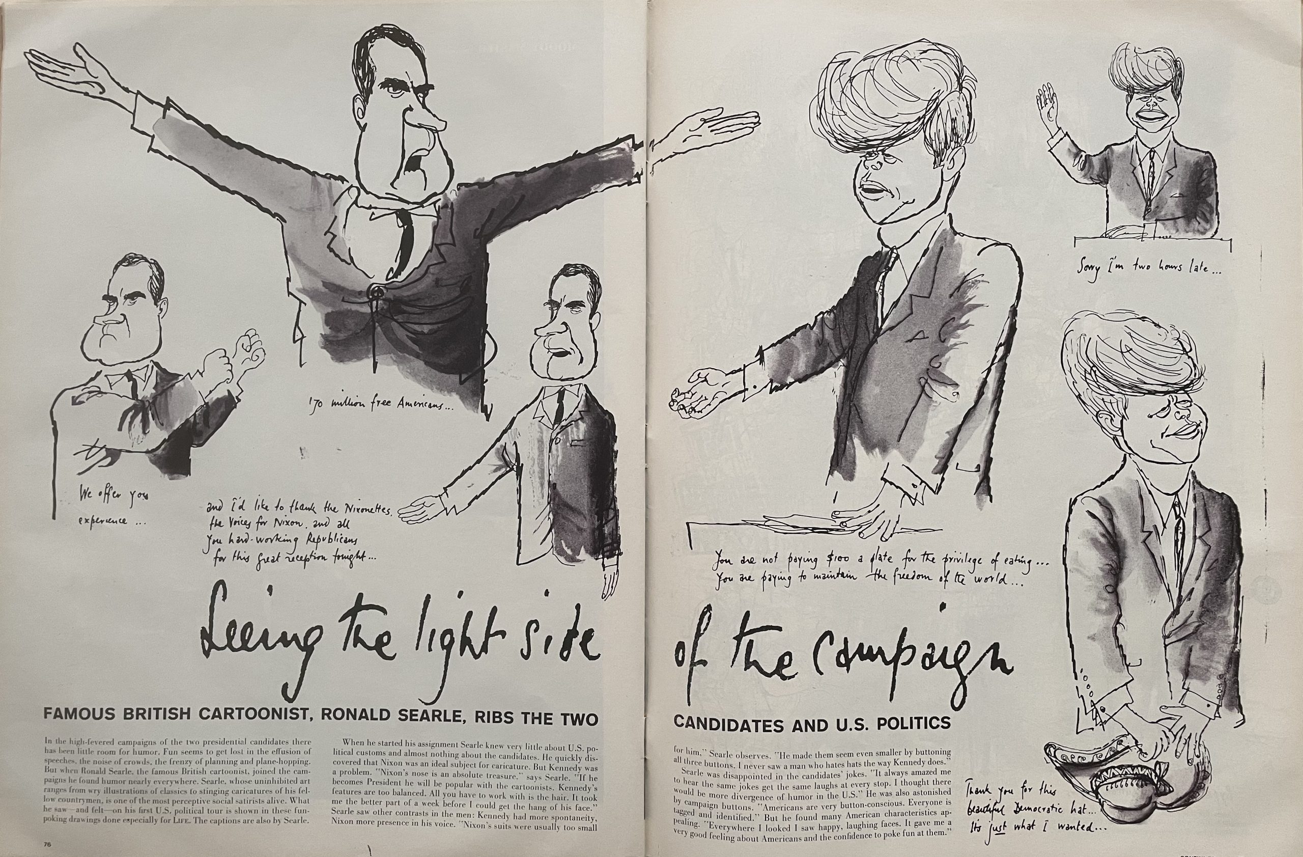 Life, October 31, 1960 : Ronald Searle followed the U.S. presidential campaign between John F. Kennedy and Richard Nixon. His drawings reduce the race to sharp caricatures: Kennedy with a towering quiff, Nixon with rigid gestures, the campaign trail as a sequence of rallies, bars, and TV images.