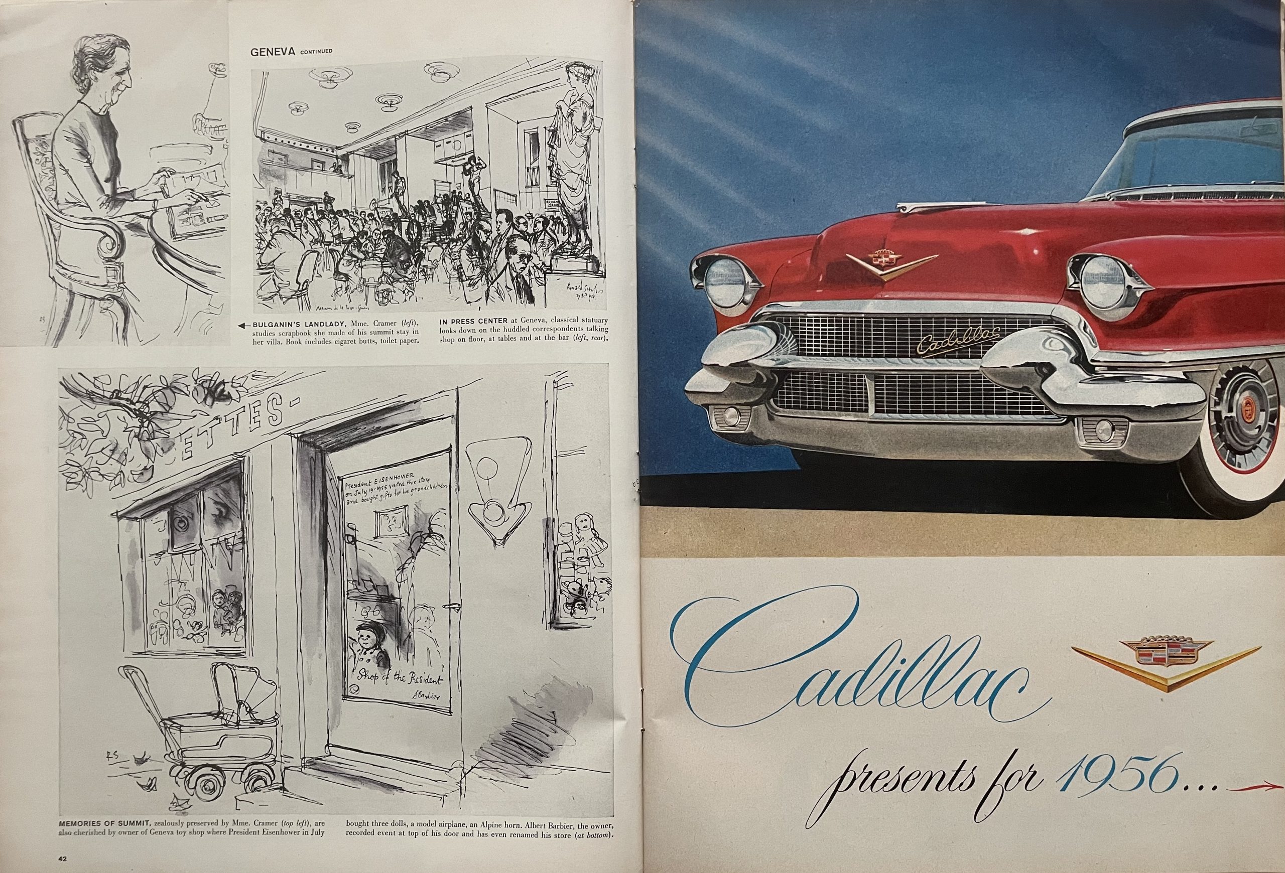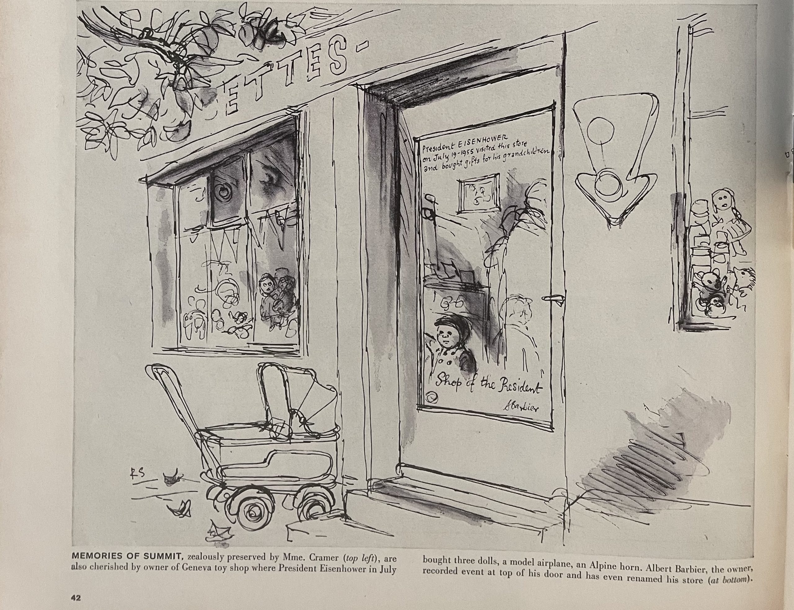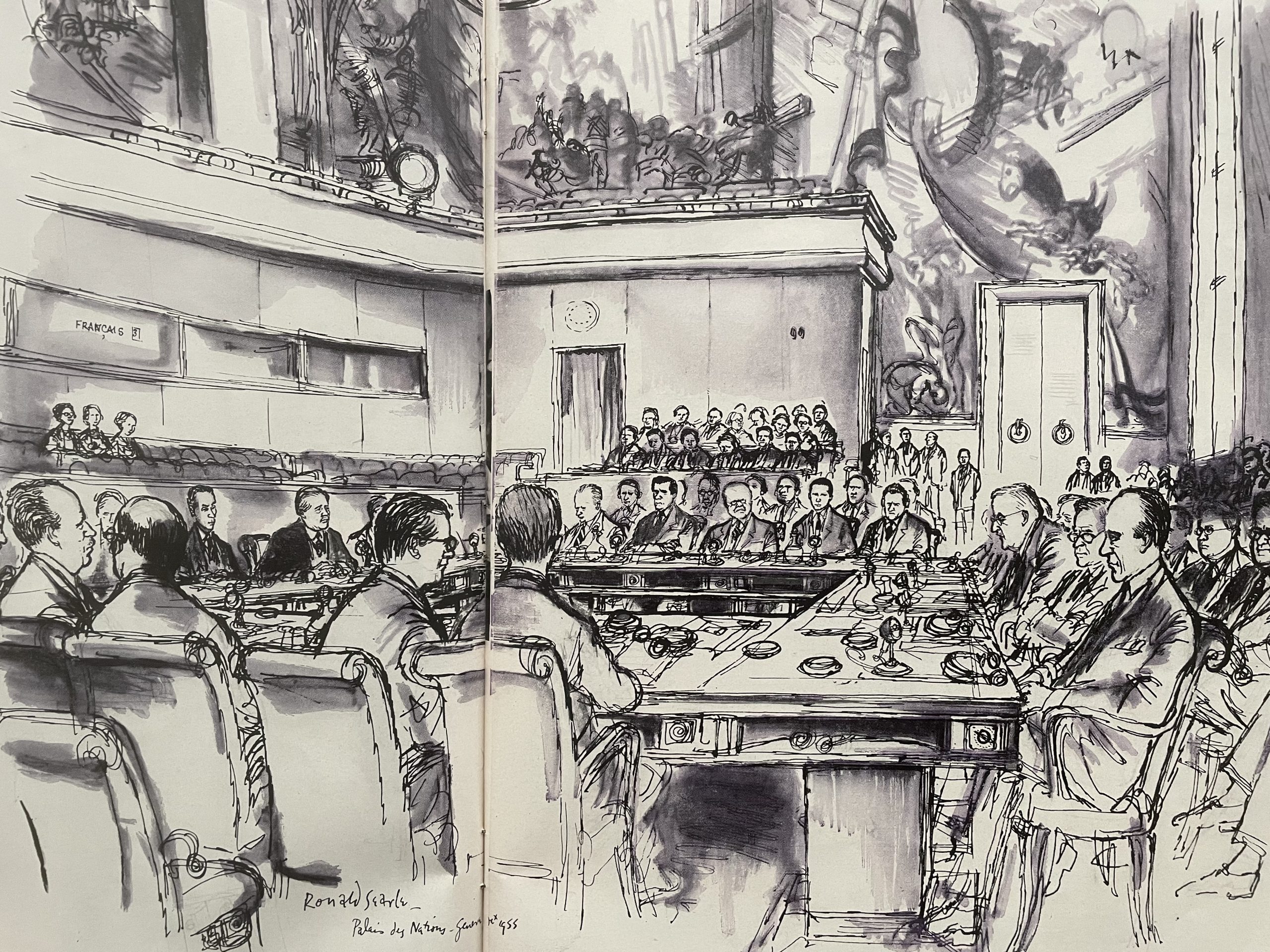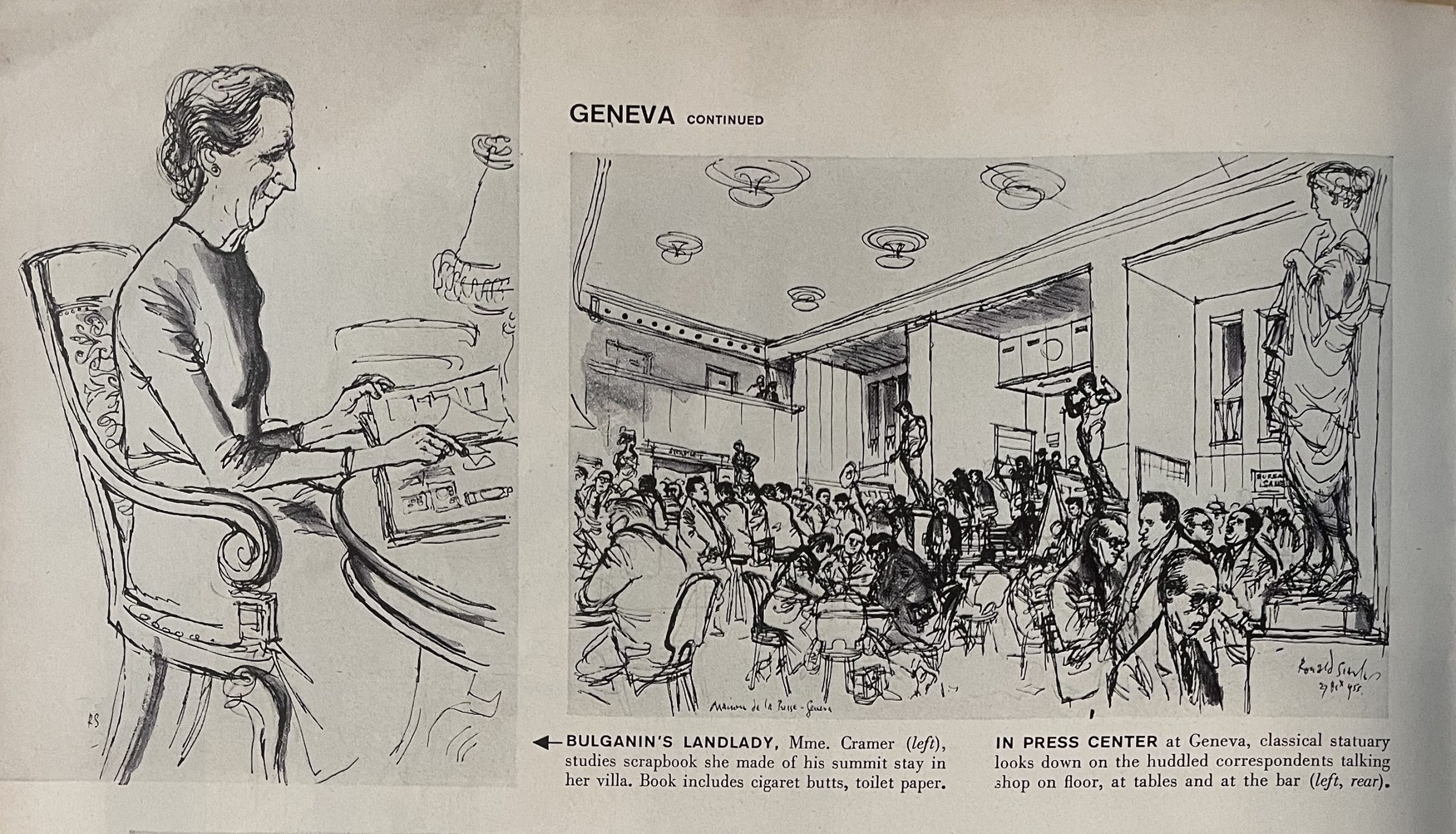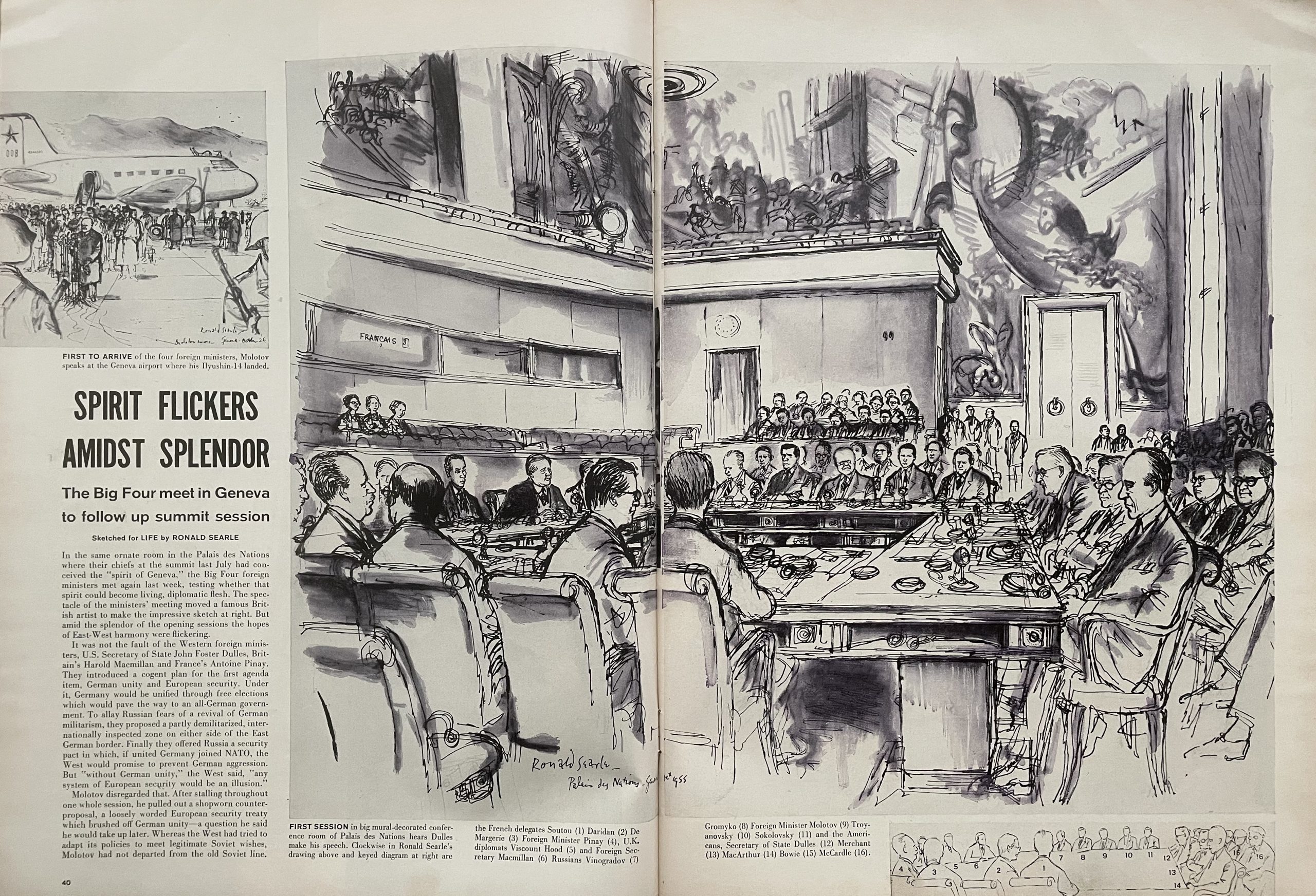 Life, November 7, 1955: Ronald Searle drew the Geneva Conference of the Big Four foreign ministers—Dulles, Macmillan, Molotov, Pinay—at the Palais des Nations. The meeting followed the summer summit and raised hopes for détente, but produced little beyond symbolism. Searle’s sketches register the setting and the delegates in session.